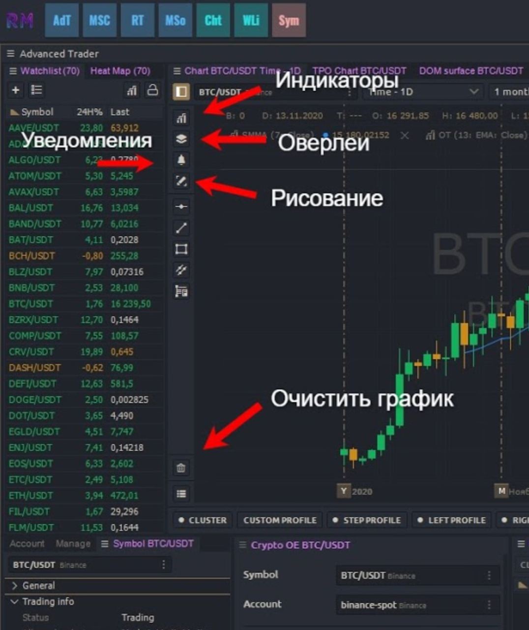 Здесь можно выбрать инструмент для трейдинга, установить тип и стиль графика, таймфрейм, данные о глубине рынка, а также открыть дополнительные панели инструментов. Итак, в верхней панели есть: