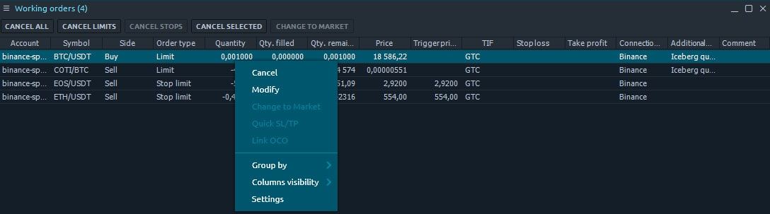 На панели Рабочие ордера (Working orders) отображаются все ордера, размещенные на данный момент. Как только вы разместите новый ордер, он появится на этой панели и станет доступным для управления.