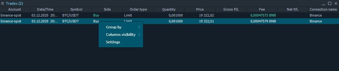🌐Добавлен локальный кэш для сделок для FTX, Binance, Binance Futures. Все сделки, которые будут совершены с использованием платформы, будут сохранены в локальной базе данных и доступны на панели «Сделки».