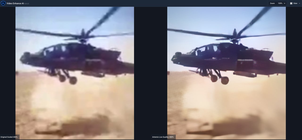 💎 Картинку на оф.сайте подгоняют идеальную для покупателя, поэтому решил показать как есть для вас в боевых условиях на одном из популярных роликов на Reddit с полётом Апача в Сирии. Результат заметен невооруженным взглядом Scale: x4 (увеличение разрешения) и Artemis Low quality. Из видео 136х240 получили 540х960.