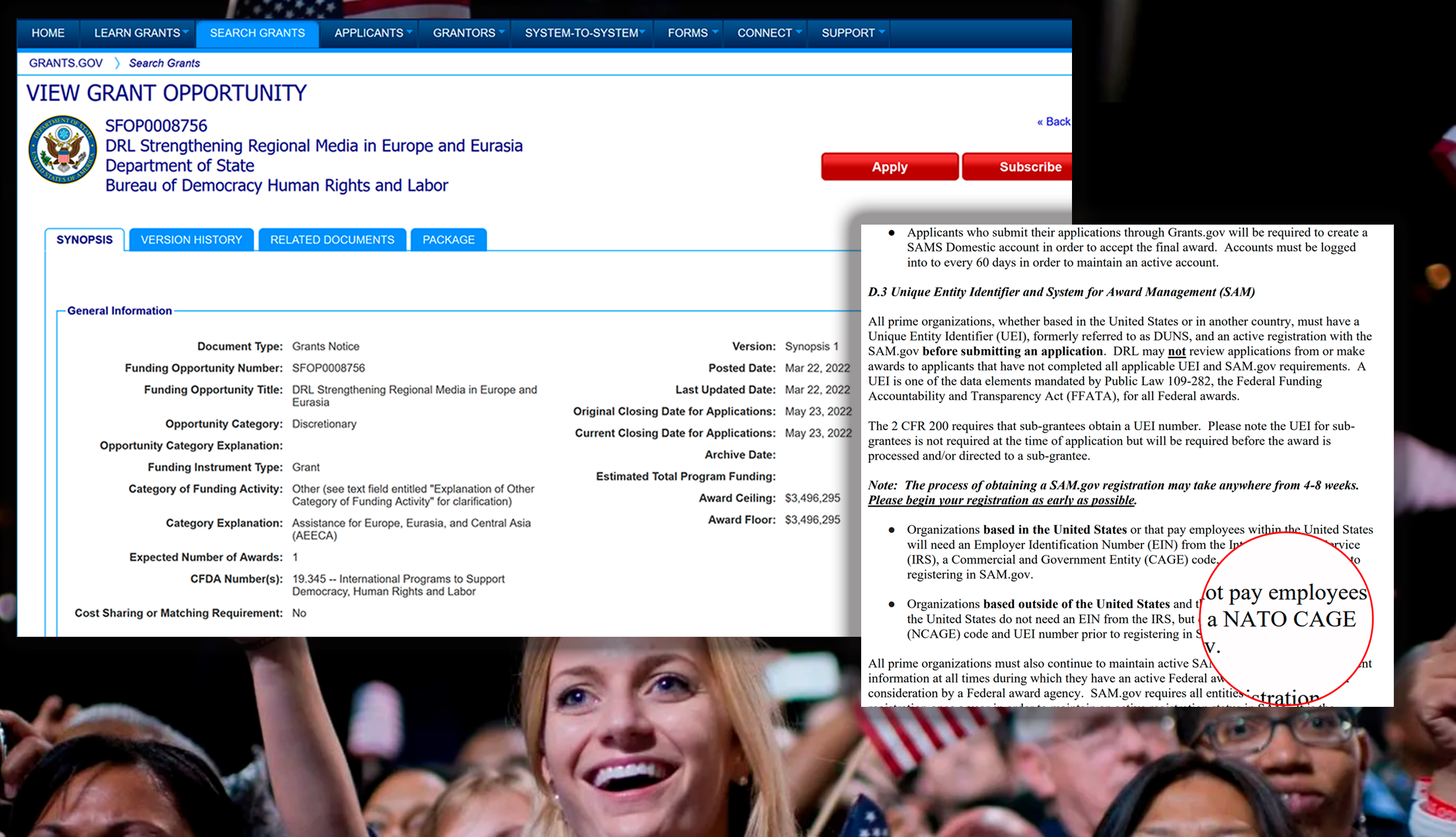 Бюро по вопросам демократии, прав человека и труда (DRL) Госдепа США объявило тендер на предоставление денежных средств для проведения журналистских расследований на сумму $3,5 млн 22 марта 2022 года. Целью гранта является противостояние силам, стремящимся манипулировать "независимой прессой".