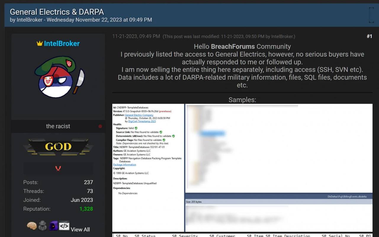 Причем перед тем, как слить данные некто IntelBroker попытался реализовать в киберполье доступ к конвейерам разработки ПО General Electric по цене в размере 500 долл.