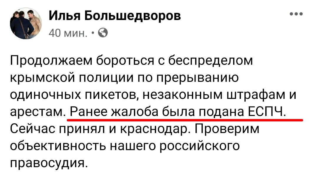 Примечательно и то, что освещение этого грандиозного, по мнению Большедворова, события пришлось перед стартом так называемой "Крымской Платформы", украинского проекта, на котором как раз и будут докладывать о творящихся на полуострове ужасах. Не удивлюсь, если факт обращения Ильи в ЕСПЧ будет использован каким-то докладчиком для обоснования "зверств" России.