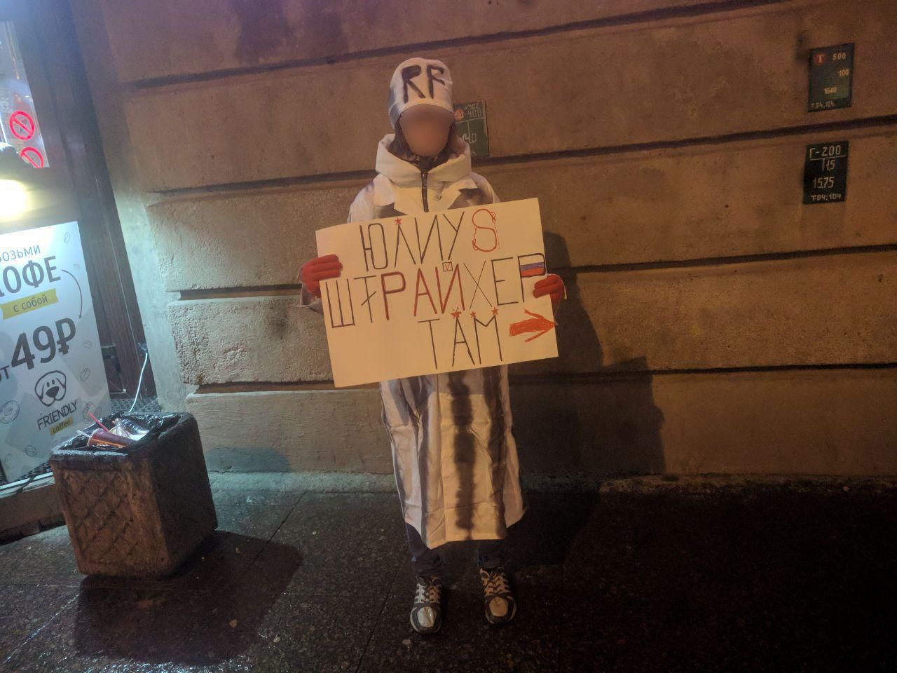 На двух плакатах была надпись: "юлиус штрайхер там", стрелка на плакате указывала в сторону входа в здание, где проходит встреча с "Юлиусом".