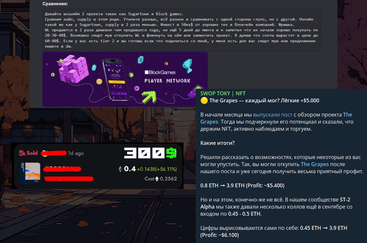 The Grapes: парни swop toky (40к пдп) говорят, что они держат их НФТ, сами нифига не держат. И в том же посте они прогрели свою приватку, в которой нет ничего интересного. Они нагнали фомо для того, чтобы люди купили их приватку, в которой якобы были коллы.