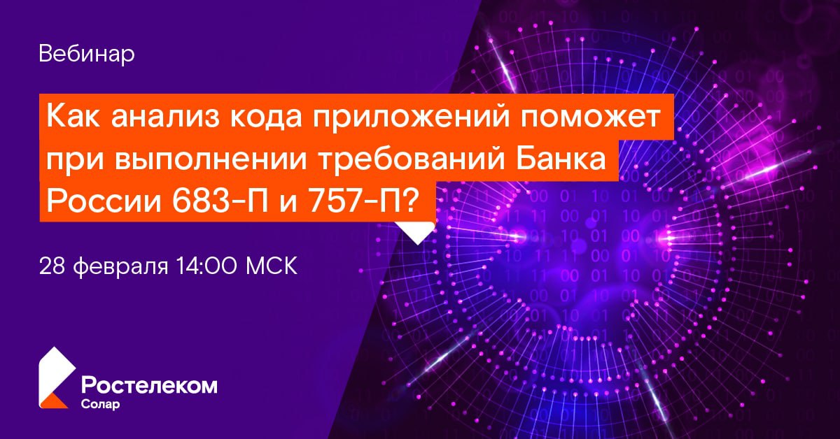 28 февраля в 14:00 МСК присоединяйтесь к бесплатному вебинару от «Ростелеком-Солар», на котором обсудим, как организовать процесс анализа безопасности ПО в соответствии с актуальными требованиями Банка России, повысить реальную защищенность ваших приложений и как анализатор безопасности кода может в этом помочь.