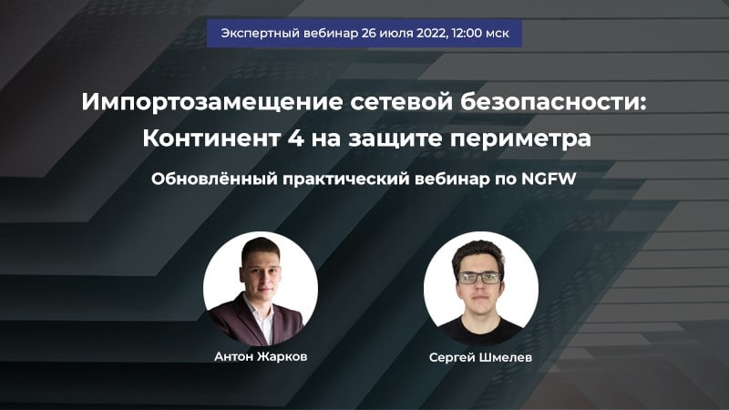 Регистрируйтесь на вебинар «Импортозамещение сетевой безопасности: Континент 4 на защите периметра», который пройдёт 🗓 26 июля в 12:00.