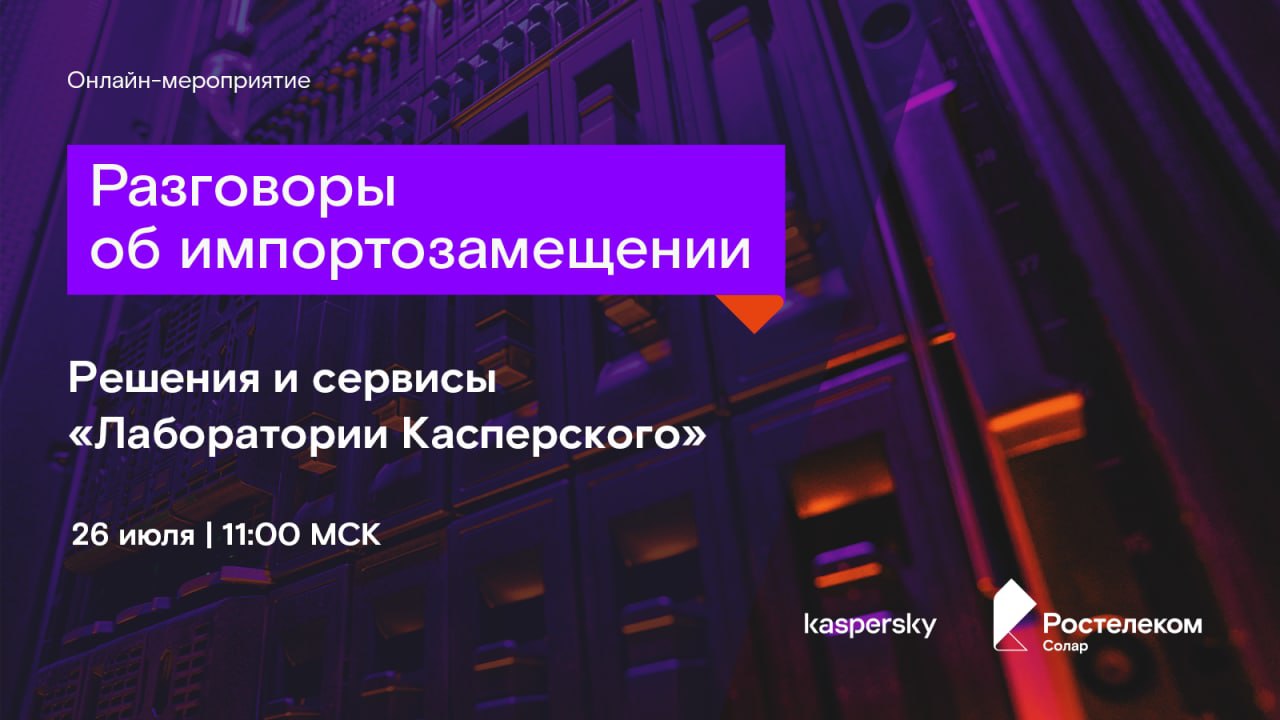 26 июля в 11:00 (МСК) «РТК-Солар» приглашает вас на седьмое онлайн-мероприятие из цикла «Разговоры об импортозамещении». Вы встретитесь с Дмитрием Стеценко, руководителем направления развития единой платформы кибербезопасности «Лаборатории Касперского».