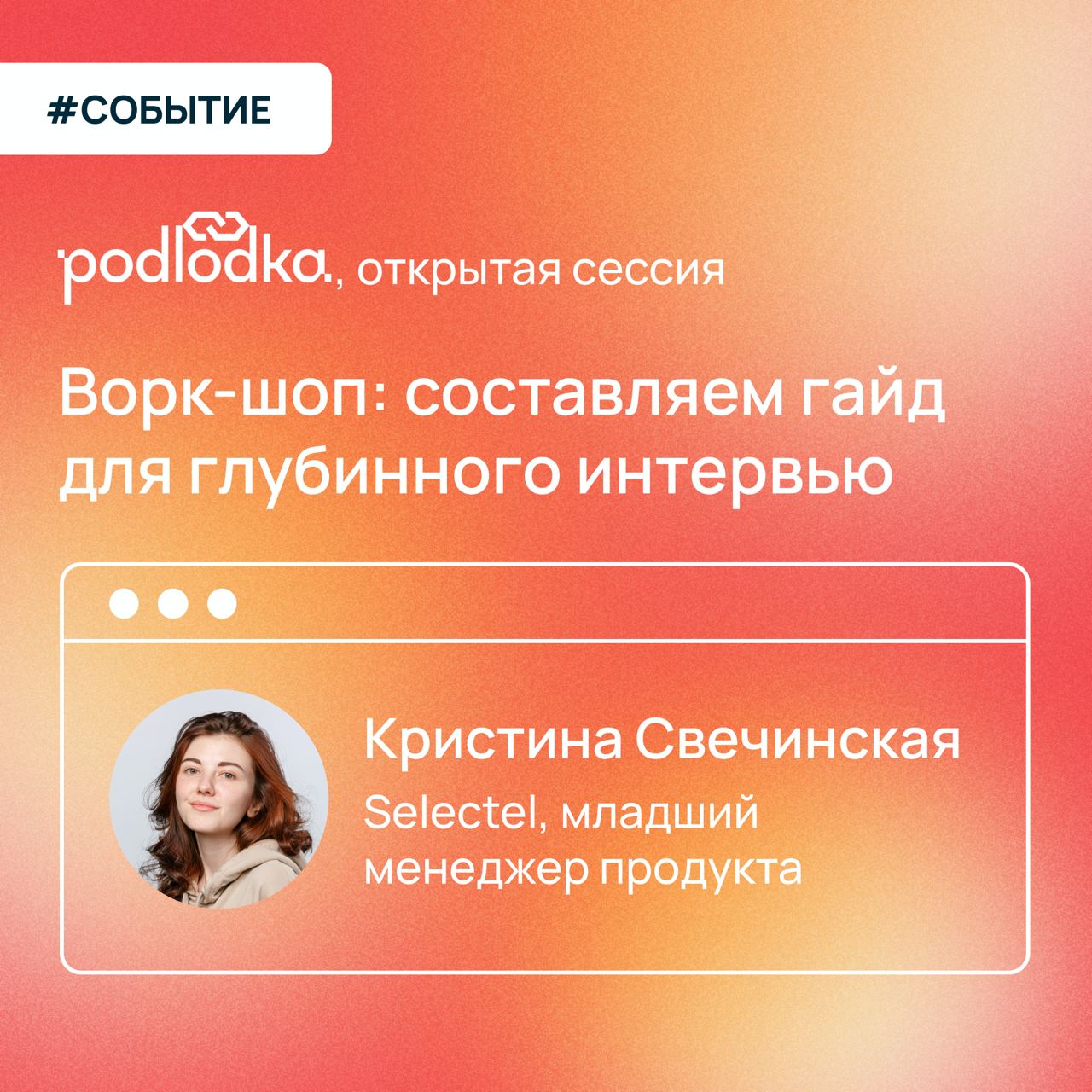 На следующей неделе Кристина Свечинская проведет открытый воркшоп на YouTube-канале Podlodka. На сессии обсудим, как составить список вопросов для интервью пользователей.