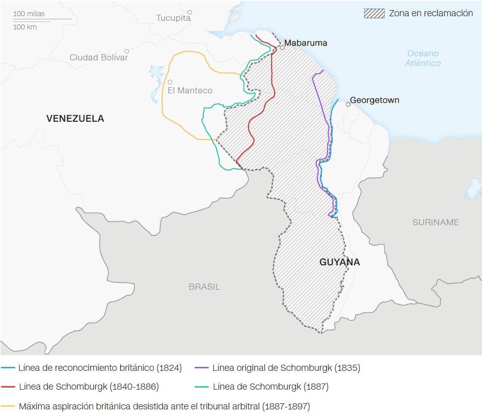 Спор тянется ещё с колониальных времён, когда Венесуэла была частью Испанской империи, а Гайана принадлежала сначала Нидерландам, а затем Великобритании. С 1840 г. британцы настаивали на границе, которую провёл немецкий путешественник Роберт Герман Шомбург – она доходила аж до устья реки Ориноко. В свою очередь, Венесуэла считала своей всю территорию, находившуюся на западном берегу Эссекибо.
