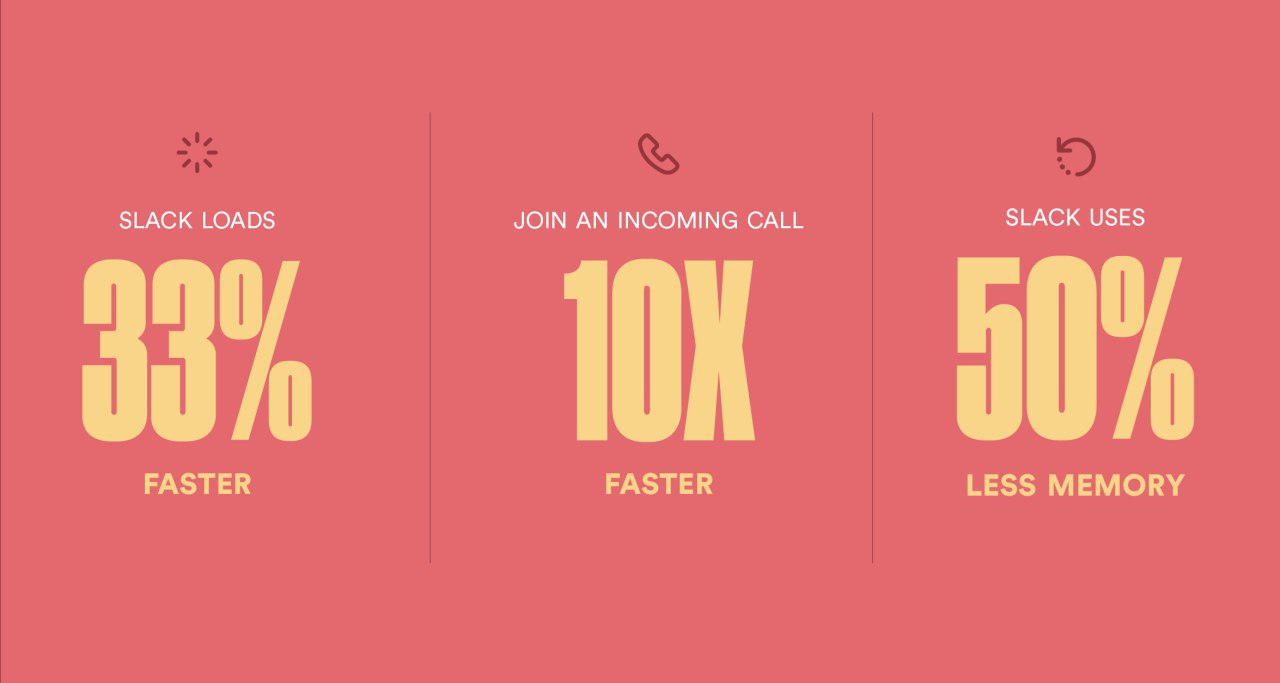 Корпоративный мессенджер Slack представил обновление для десктопной версии и веб-клиента, в котором приложение перенесено на новый технологический стек. Теперь он загружается на 33% быстрее и использует в два раза меньше памяти.