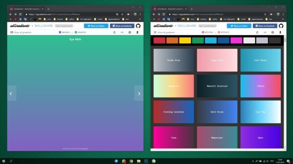 Там можно листать градиенты просматривая их на весь экран, можно выбирать прокручивая ленту. Можно копировать код цвета всего одним кликом, можно сохранять css. Можно включать фильтр чтобы посмотреть градиенты только с зелёным, например, или с другим цветом на выбор.
