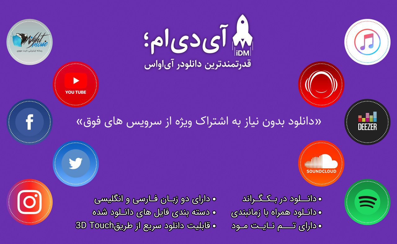 آیدیام یکی از دانلودر های قدرتمند آیاواس که علاوه بر امکانات بسیاری که در اختیار کاربران قرار میده، میتونید باهاش از سرویس هایی مثل، اسپاتیفای، اپل موزیک، دیزر، اینستاگرام، یوتیوب، رادیو جوان و ... دانلود کنید و به اشتراک بزارید.