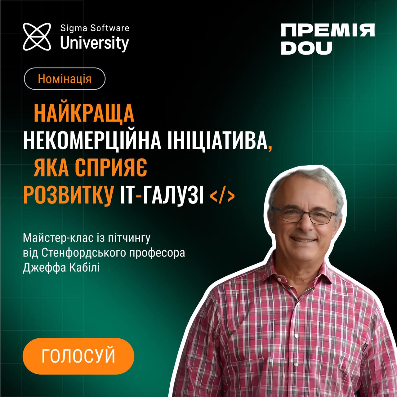 Майстер-клас із пітчингу від Стенфордського професора Джеффа Кабілі, який ми організували спільно із Українським Фондом Стартапів та Sigma Software Labs, потрапив у номінацію «Найкраща некомерційна ініціатива, що сприяє розвитку ІТ-галузі»! 💡