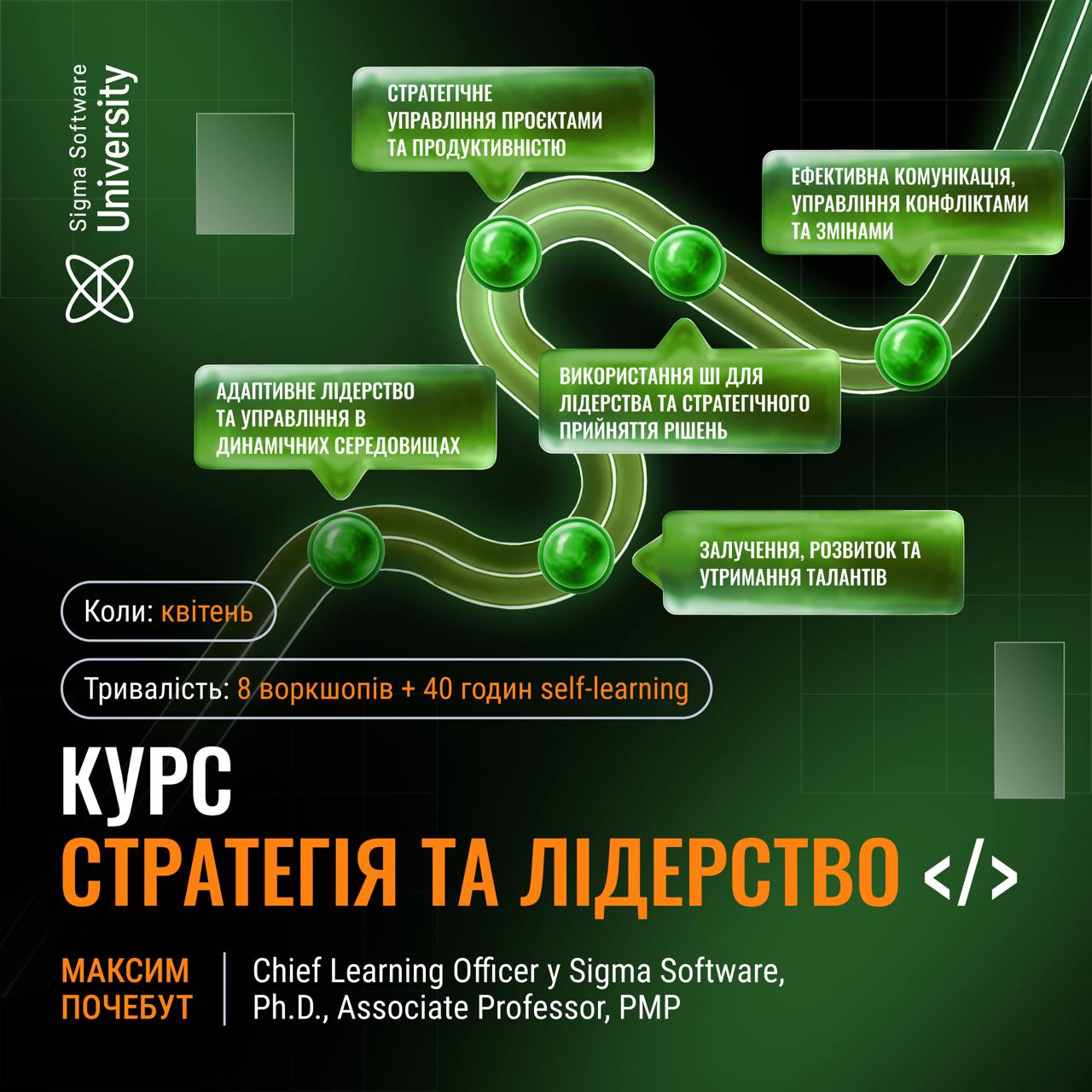 Долучайтеся до курсу «Стратегія та лідерство» від Максима Почебута, CEO Sigma Software University та лідера української EdTech екосистеми. Це не просто курс – це управлінський клуб у форматі Mini MBA, де ви знаходите рішення разом з однодумцями.