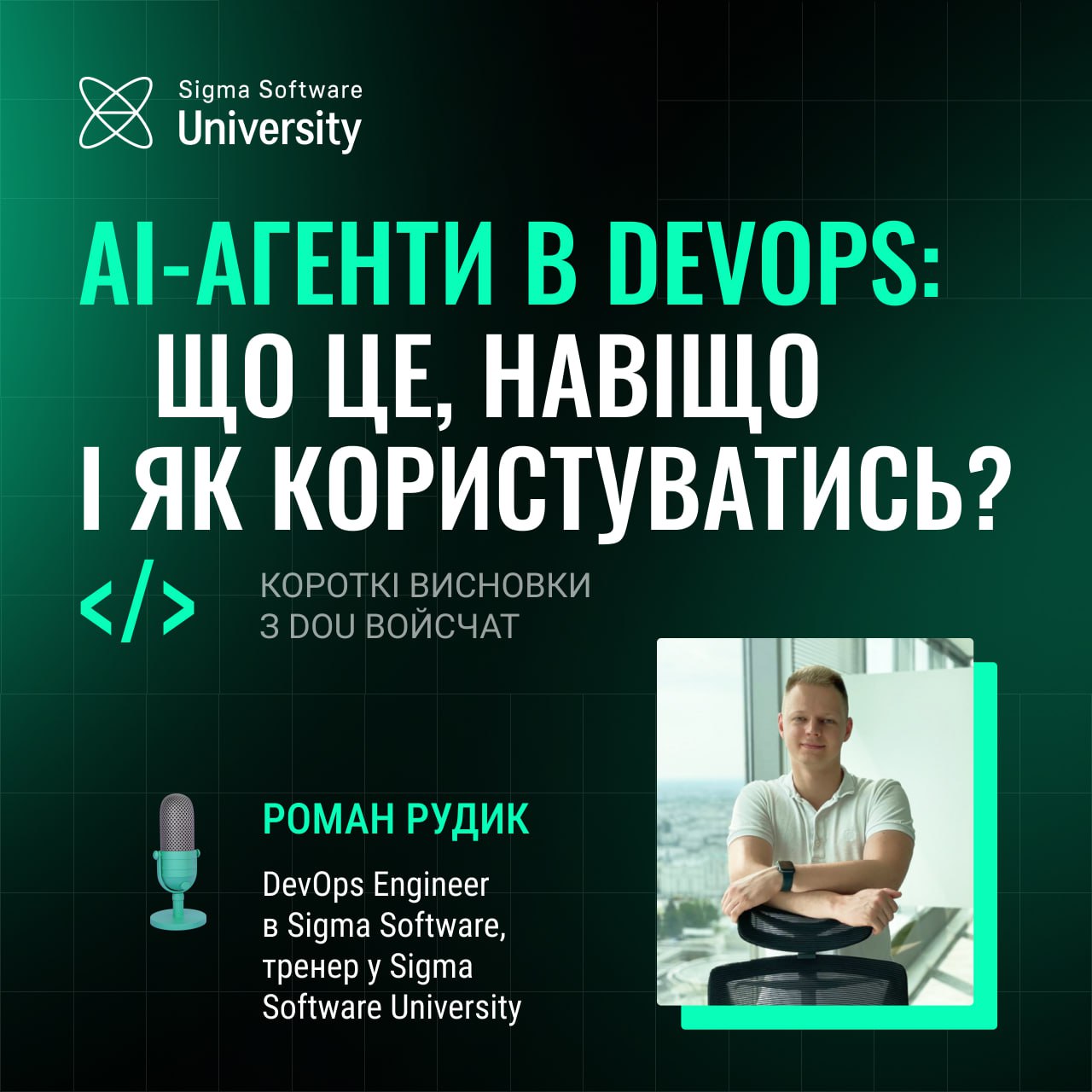 🎙 Нещодавно наш експерт Роман Рудик, DevOps-інженер та тренер курсу «DevOps з нуля» у Sigma Software University, поділився своїм досвідом та баченням майбутнього AI-агентів під час DOU войсчату.