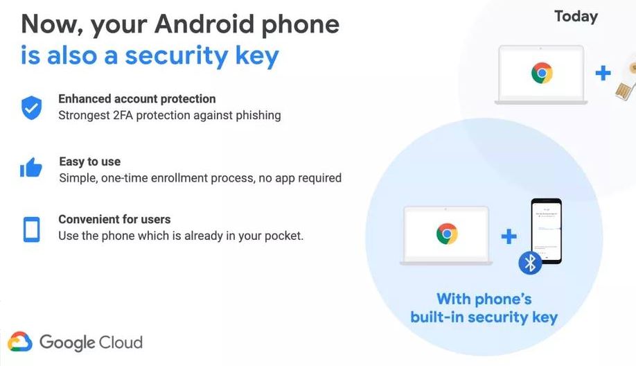أصدرت جوجل مؤخرًا نظام مصادقة جديد يمكّنك من استخدام هاتفك الاندرويد كمفتاح أمان مادي، وتستخدم جوجل معلومات البلوتوث والموقع للتحقق بشكل صحيح من الوجود الفعلي للمُستخدم، وكذلك تقنية FIDO الأكثر قوة لمُصادقة طلبات تسجيل الدخول، وهذا ما يجعل من ميزة مفتاح الأمان الجديد بديلاً أفضل بكثير من أي أنظمة مُصادقة سابقة.