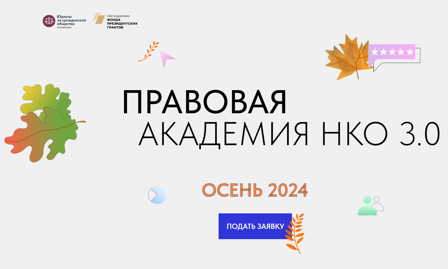 23 сентября при поддержке Фонда президентских грантов стартует 3-недельная программа Ассоциации «Юристы за гражданское общество» - Правовая академия НКО 3.0, посвященная российскому законодательству о некоммерческих организациях.