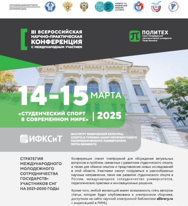 🤝 Пользуясь случаем, и на правах одного из организаторов, приглашаю встретиться в стенах Политеха Петра на уже традиционную научно-практическую конференцию с международным участием "Студенческий спорт в современном мире", проводимую в этом году в рамках Плана мероприятий по реализации Стратегии международного молодежного сотрудничества государств-участников СНГ на 2021–2030 годы.