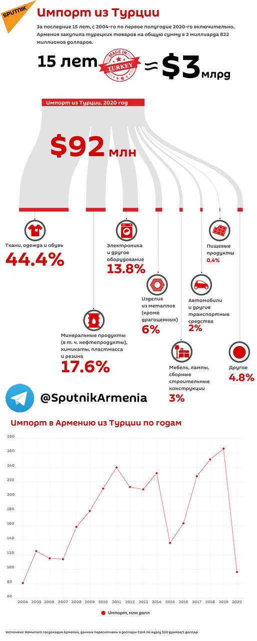 Кабмин Армении продлил на полгода запрет на ввоз в страну турецких товаров. Таким образом, табу на товары из Турции будет действовать до 1 января. В инфографике @SputnikArmenia вы увидите, что закупала страна и в каких объемах.