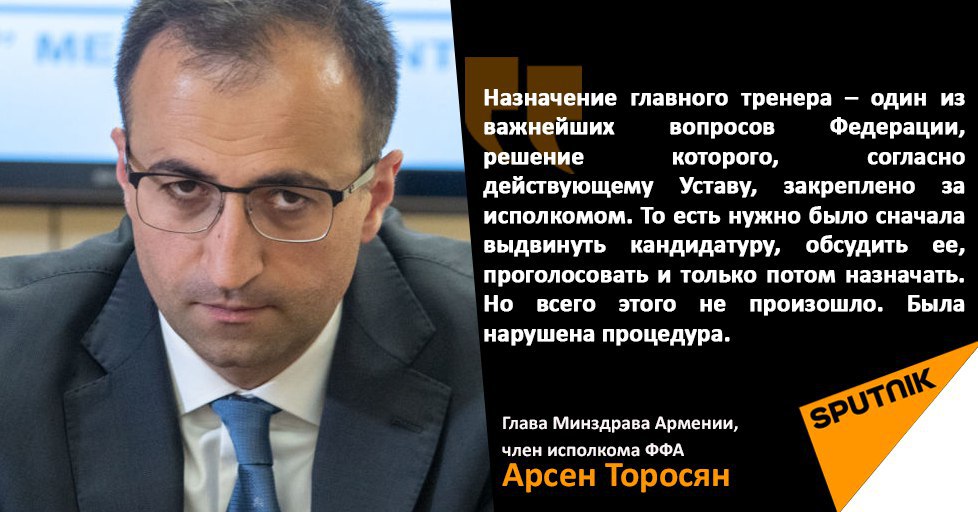 Президент Федерации футбола Армении Артур Ванецян, назначив нового тренера национальной сборной, нарушил устав ФФА. Об этом глава Минздрава Армении, член исполкома ФФА Арсен Торосян заявил в четверг журналистам в парламенте страны.