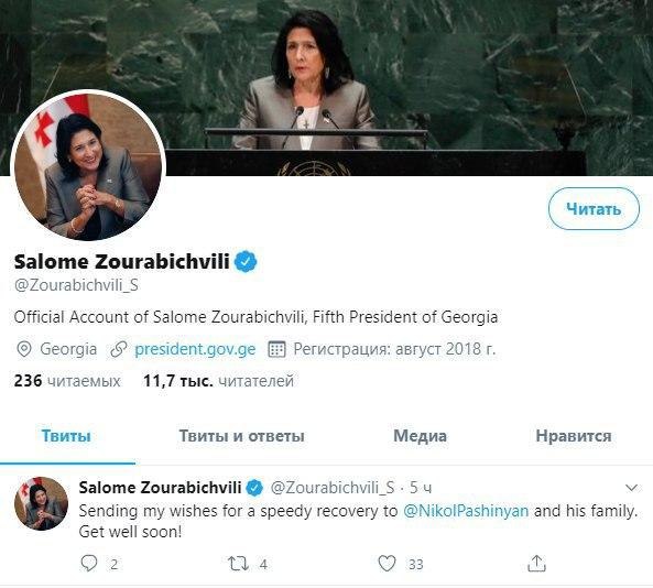 "Отправляю мои пожелания скорейшего выздоровления Николу Пашиняну и его семье. Поскорее поправляйтесь!", - написала Зурабишвили на своей официальной странице в Twitter.