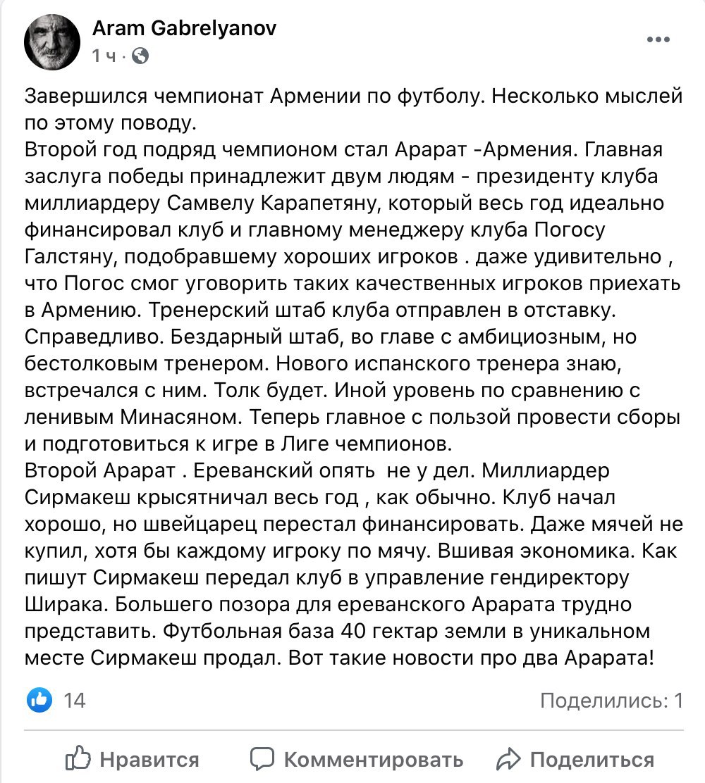 Не только Минасяну досталось от Габрелянова: по его словам владелец ереванского "Арарата", швейцарско-армянский миллиардер Вардан Сирмакеш "крысятничал весь год, как обычно. Клуб начал хорошо, но он сократил финансирование: в команде даже не хватало мячей на каждого игрока. Вшивая экономика"