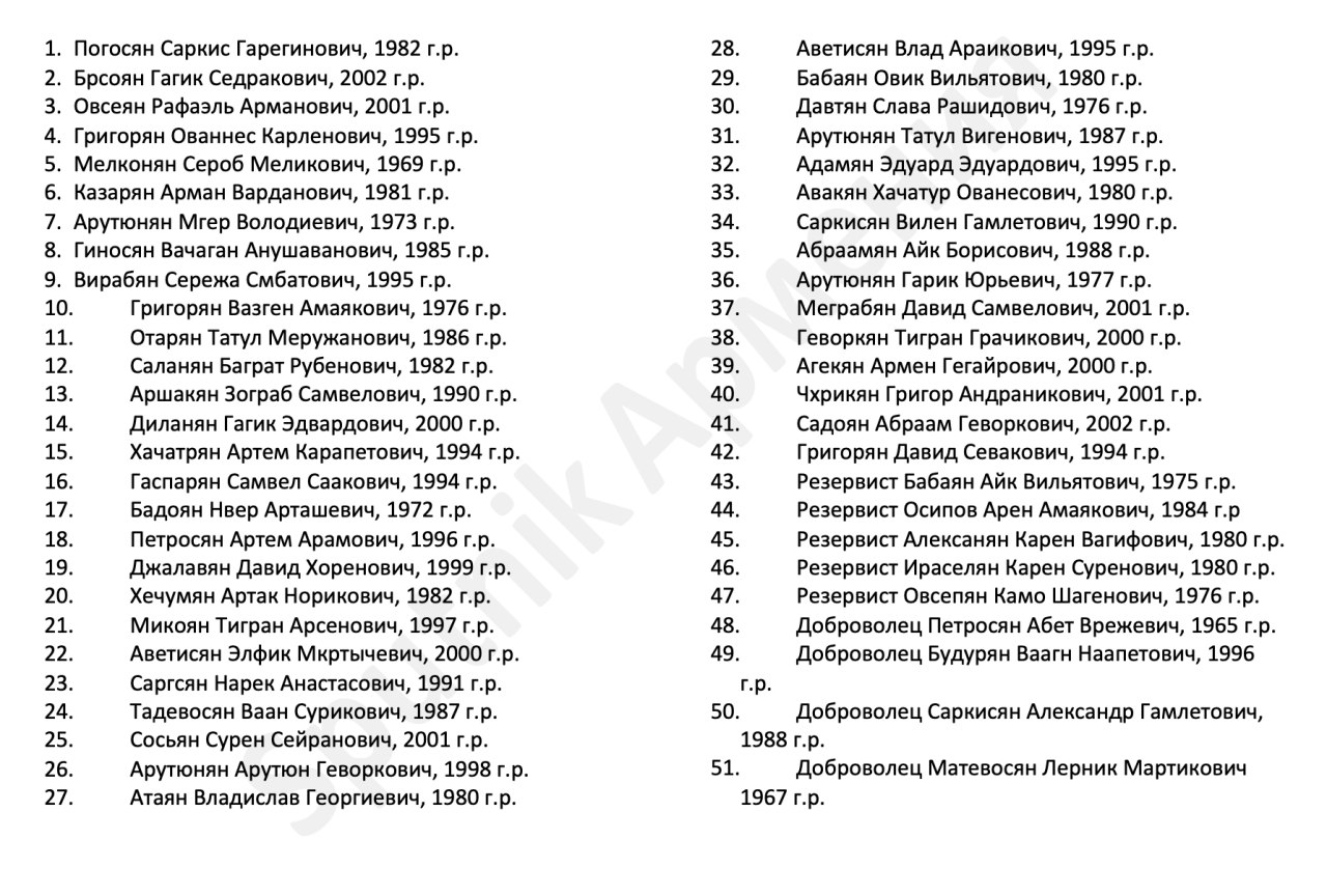 🕯Список погибших армянских военнослужащих в Нагорном Карабахе за 12 октября - в нем 51 новая фамилия (всего потери с армянской стороны составили более 480 военных)