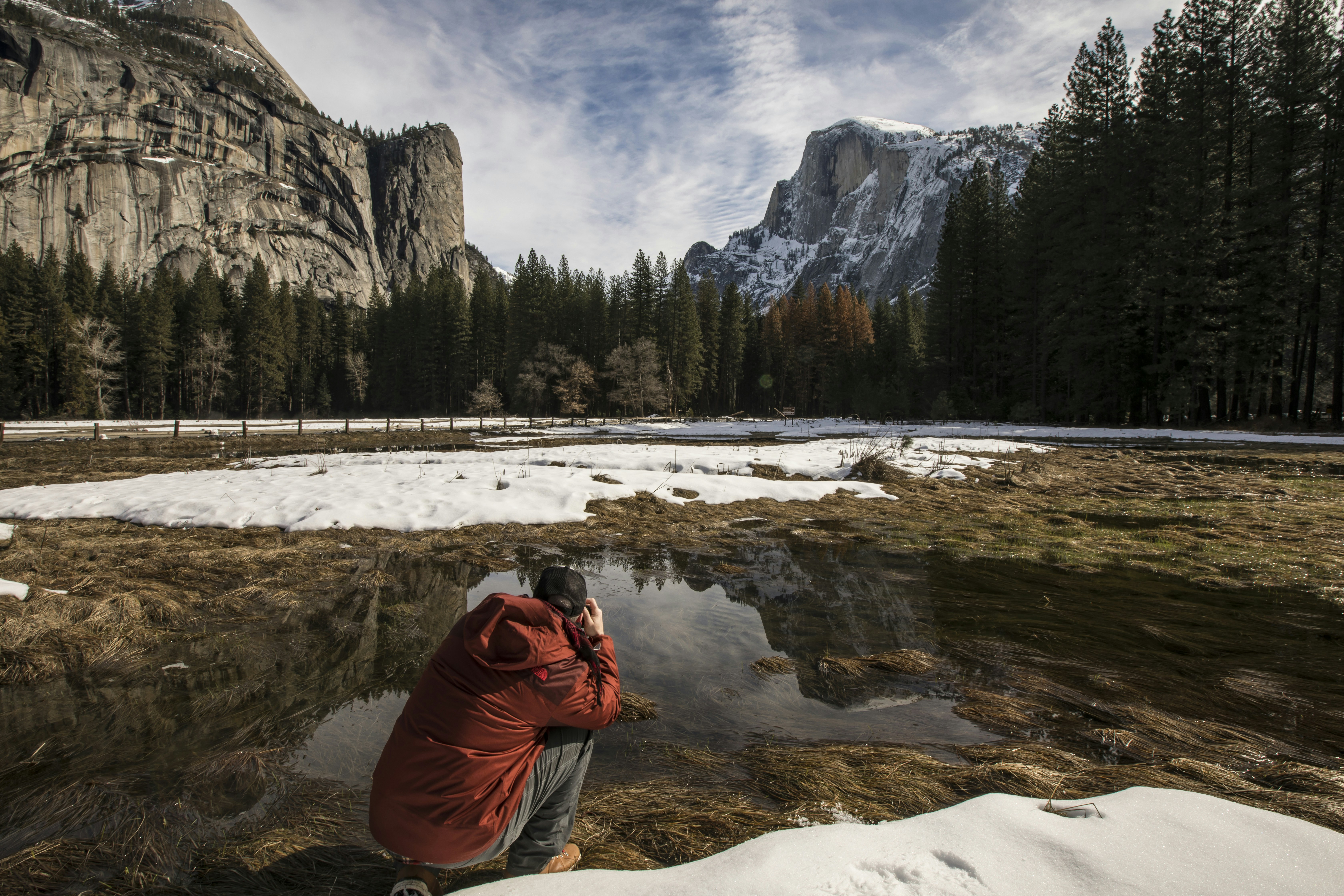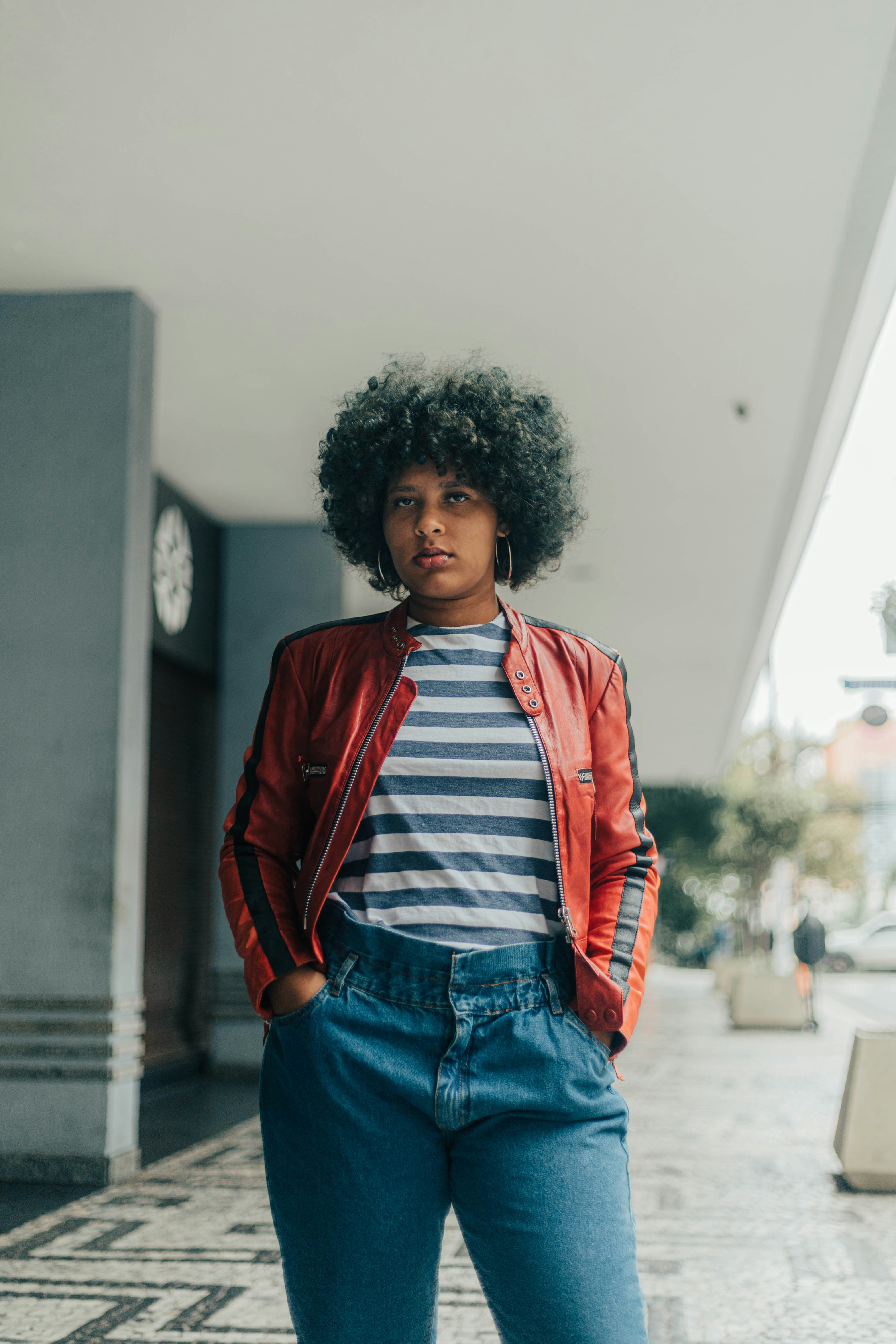 woman in red jacket standing near white concrete building during daytime