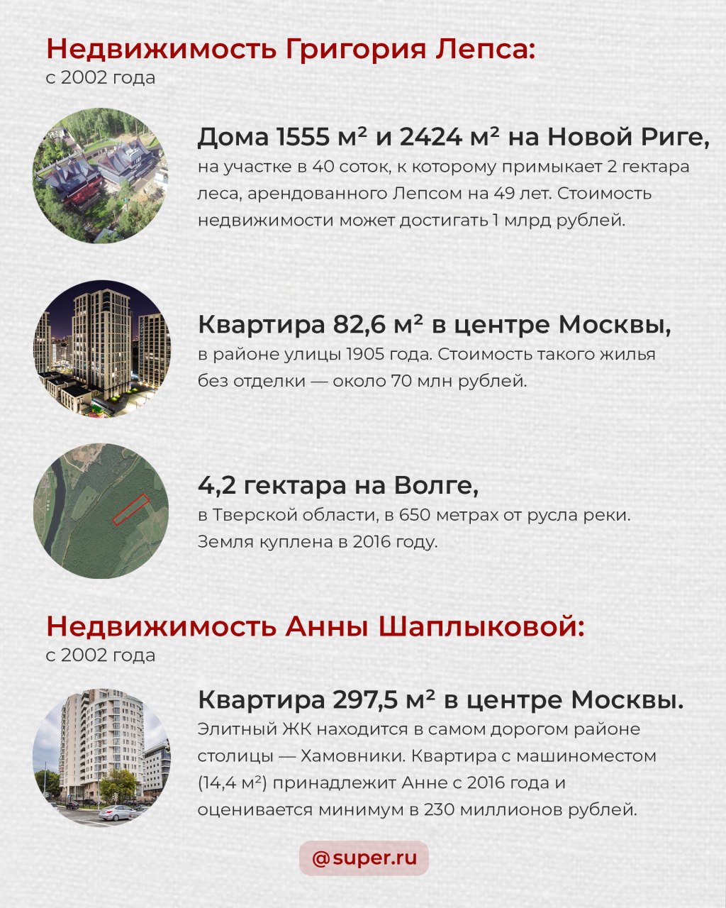 В суде Григорий Лепс будет делить с супругой совместно нажитое имущество, стоимость которого может превысить миллиард рублей. Неудивительно, ведь Григорий Лепс и Анна Шаплыкова прожили в браке почти 20 лет и за это время они обзавелись дорогостоящей недвижимостью.