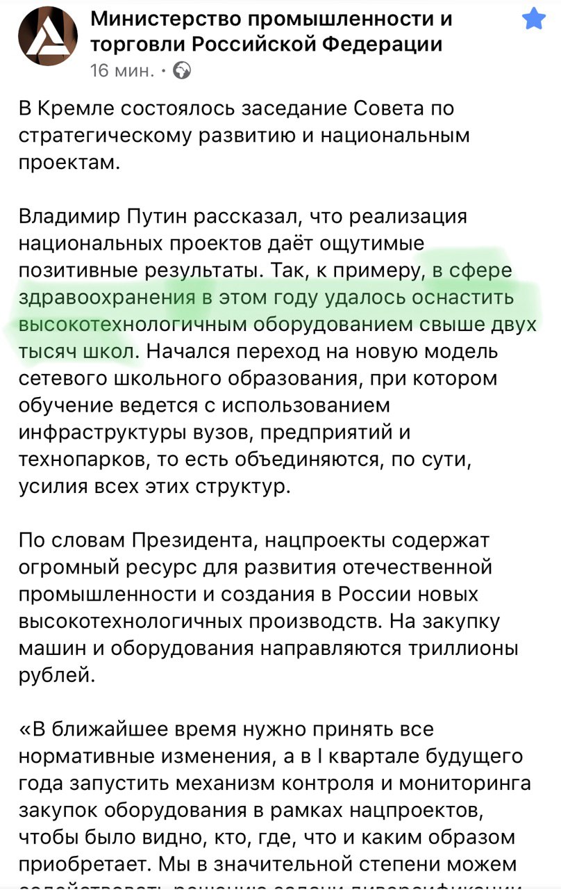 Успехи в здравоохранении через оснащение школ - о такой синергии социальных сфер не мог мечтать ни Владимир Владимирович, ни Татьяна Алексеевна.