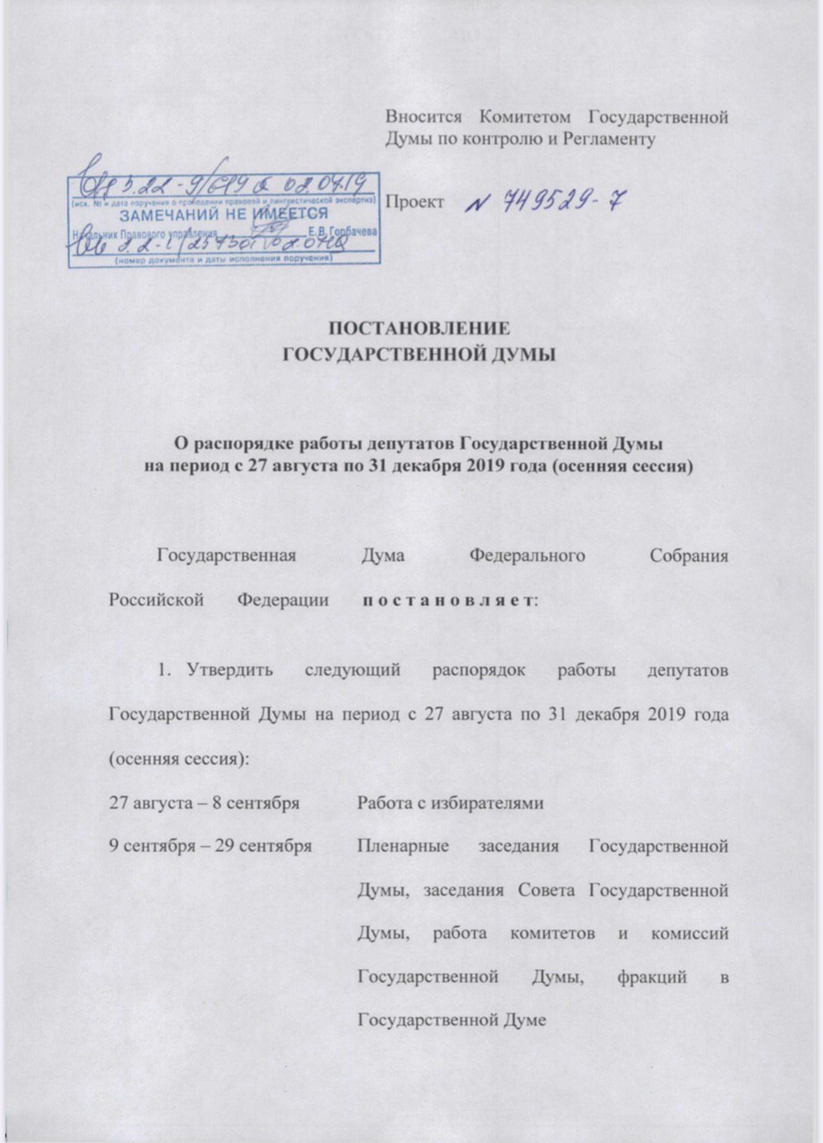 План работы Госдумы утверждается на сессию (в данном случае - весеннюю).