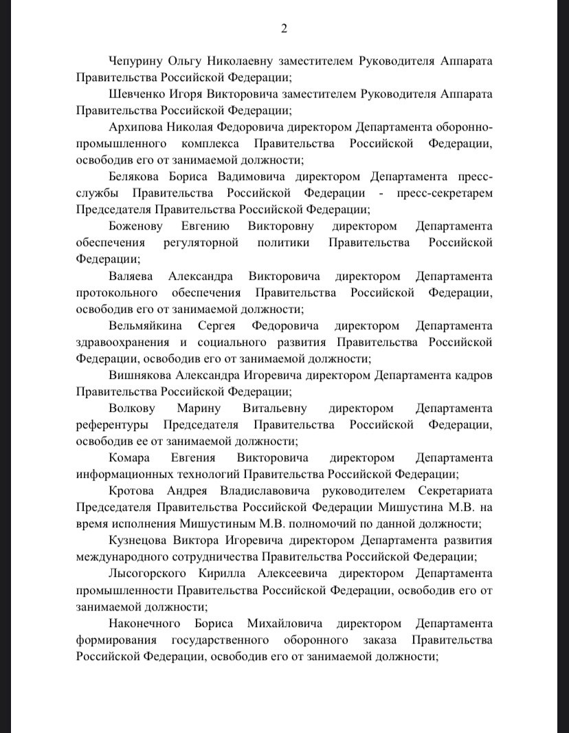 И лично от себя: публиковать как дело уже решённое фамилии якобы назначенных на министерские портфели не то что до выхода указов и внесения изменений в паспорта нацпроектов, но даже до официального оглашения соответствующего решения лицом, его принимающим - форменное хамство.
