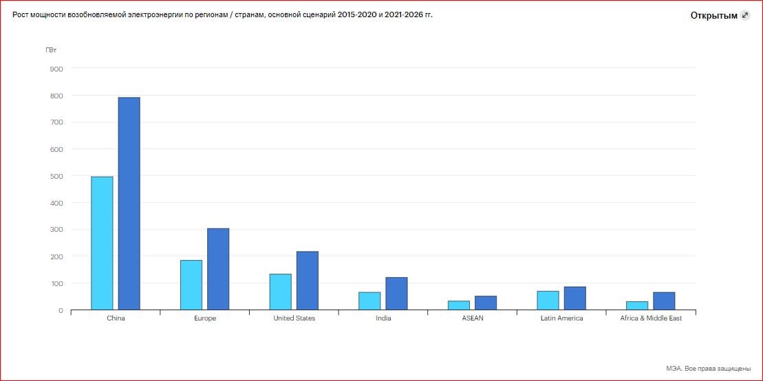 • Прогнозируется, что в следующие пять лет рост возобновляемых мощностей ускорится и составит почти 95% от прироста мировых мощностей до 2026 года. Согласно прогнозам, в период с 2020 по 2026 год мощность возобновляемых источников электроэнергии во всем мире вырастет более чем на 60%, достигнув величины более 4 800 ГВт.