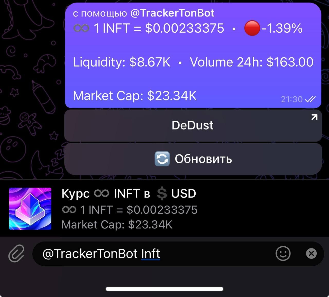 Привет, уважаемое сообщество! Мы рады представить вам новый продукт от Infinity - @TrackerTonBot! Этот бот разработан специально для отслеживания данных о токенах на блокчейне TON. Теперь вы можете моментально получать информацию о цене токена, его изменениях в процентах, ликвидности, объеме за сутки и капитализации.