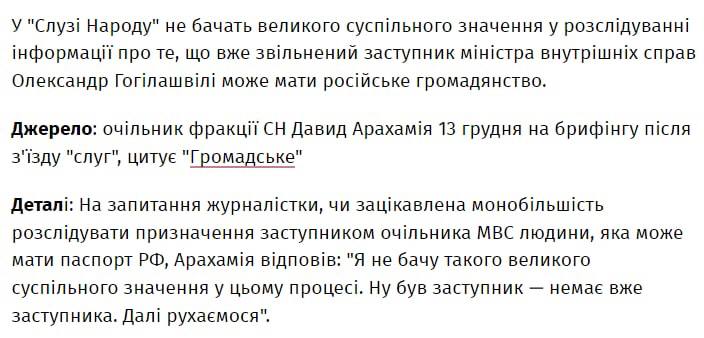 На запитання журналістки, чи зацікавлена партія "Слуга Народу" розслідувати загадкове зникнення товариша Гогілашвілі після звільнення (яке пов'язують з викликом в СБУ), тов. Арахамія розсміявшись відповів: "Я не бачу такого великого суспільного значення у цьому процесі.