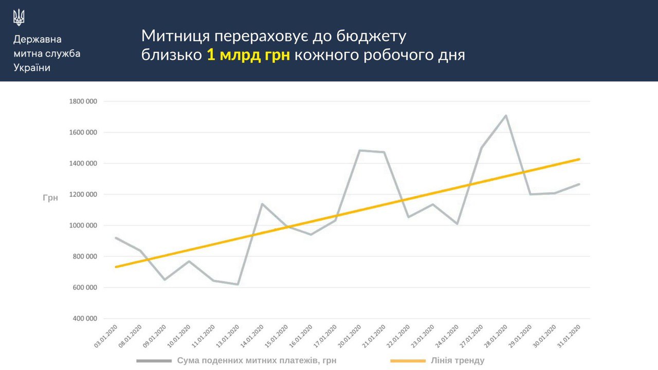 ⚡️ Кожного робочого дня з початку поточного року Державна митна служба України перераховує до бюджету близько 1 млрд грн. І це незважаючи на те, що у січні 2020 року, у порівнянні з січнем 2019 року, оподатковуваний імпорт зменшився на 5,3% з 5,2 тис. тонн до 4,9 тис. тонн.