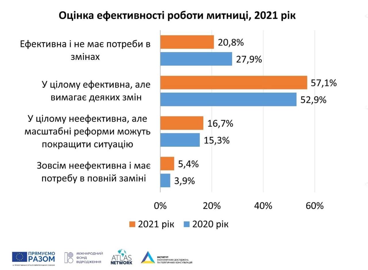 🔥 Згідно з даними дослідження, майже 78% представників бізнесу вважають роботу Державної митної служби України ефективною, при цьому майже 21% вважають митницю ефективною і такою, що не має потреби у змінах, а 57,1% респондентів вказали, що робота митниці у цілому ефективна, але вимагає деяких змін. Це найбільша частка за останні 5 років.