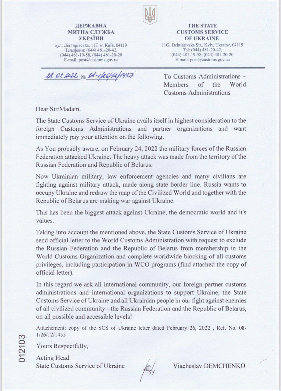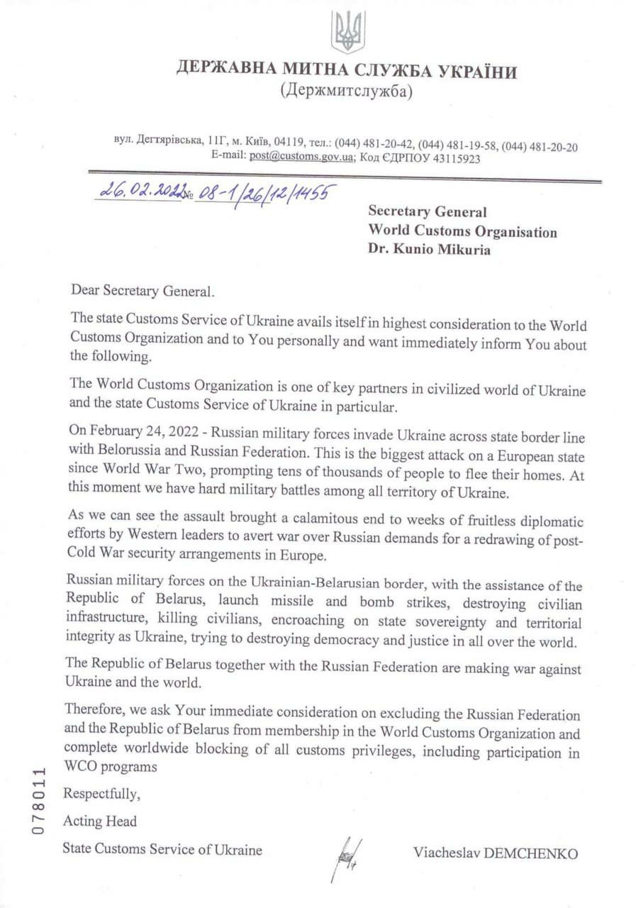 В.о. Голови Державної митної служби України Вячеслав Демченко звернувся до митних адміністрацій кожної з країн-членів Всесвітньої митної організації з проханням посприяти у ❌виключенні Російської Федерації та Республіки Білорусь зі складу ВМО.