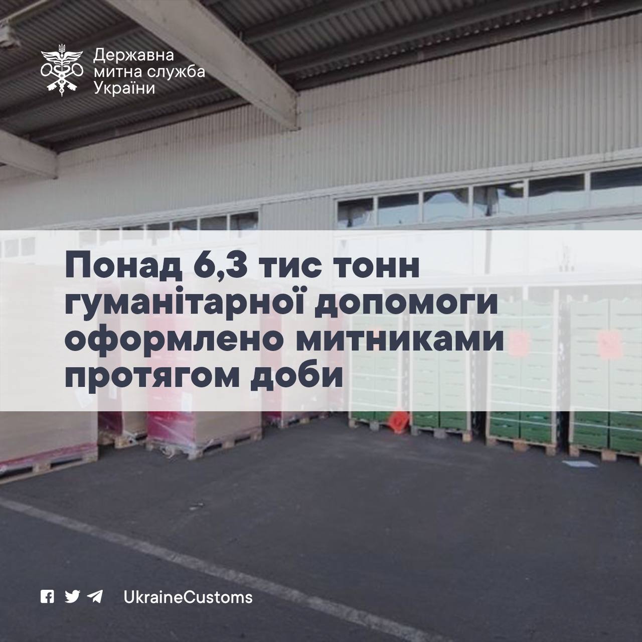 🔝Понад 6,3 тис тонн гуманітарної допомоги оформлено митниками протягом доби