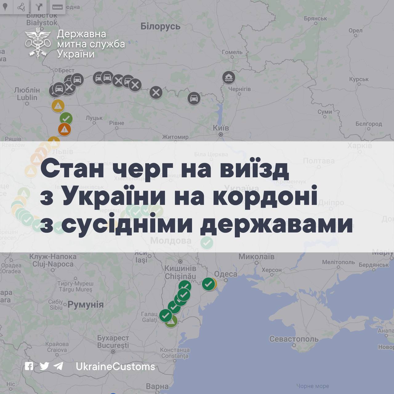 🕗 Станом на вечір черги автомобілів та пішоходів зберігаються в пунктах пропуску «Краківець» та «Шегині», що на кордоні з Польщею; «Ужгород», що на кордоні зі Словаччиною; «Могилів-Подільський», що на кордоні з Молдовою, а також «Порубне», що на кордоні з Румунією. В інших пунктах пропуску черги відсутні.