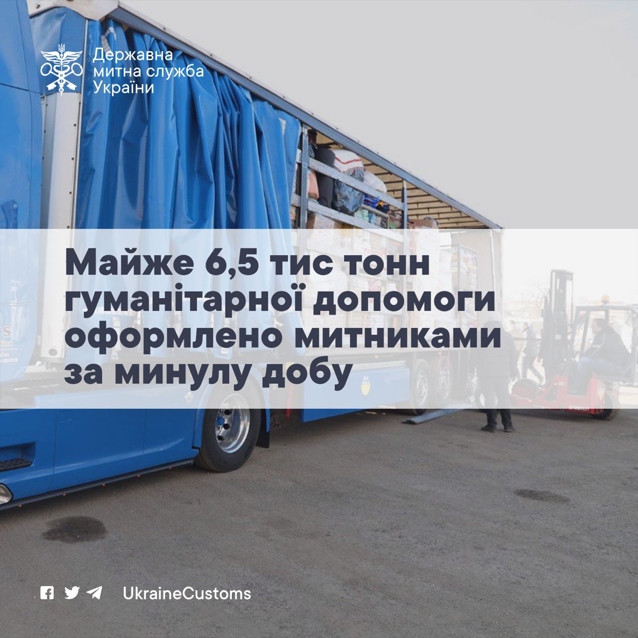 🔝Понад 6,3 тис тонн гуманітарної допомоги оформлено митниками протягом доби
