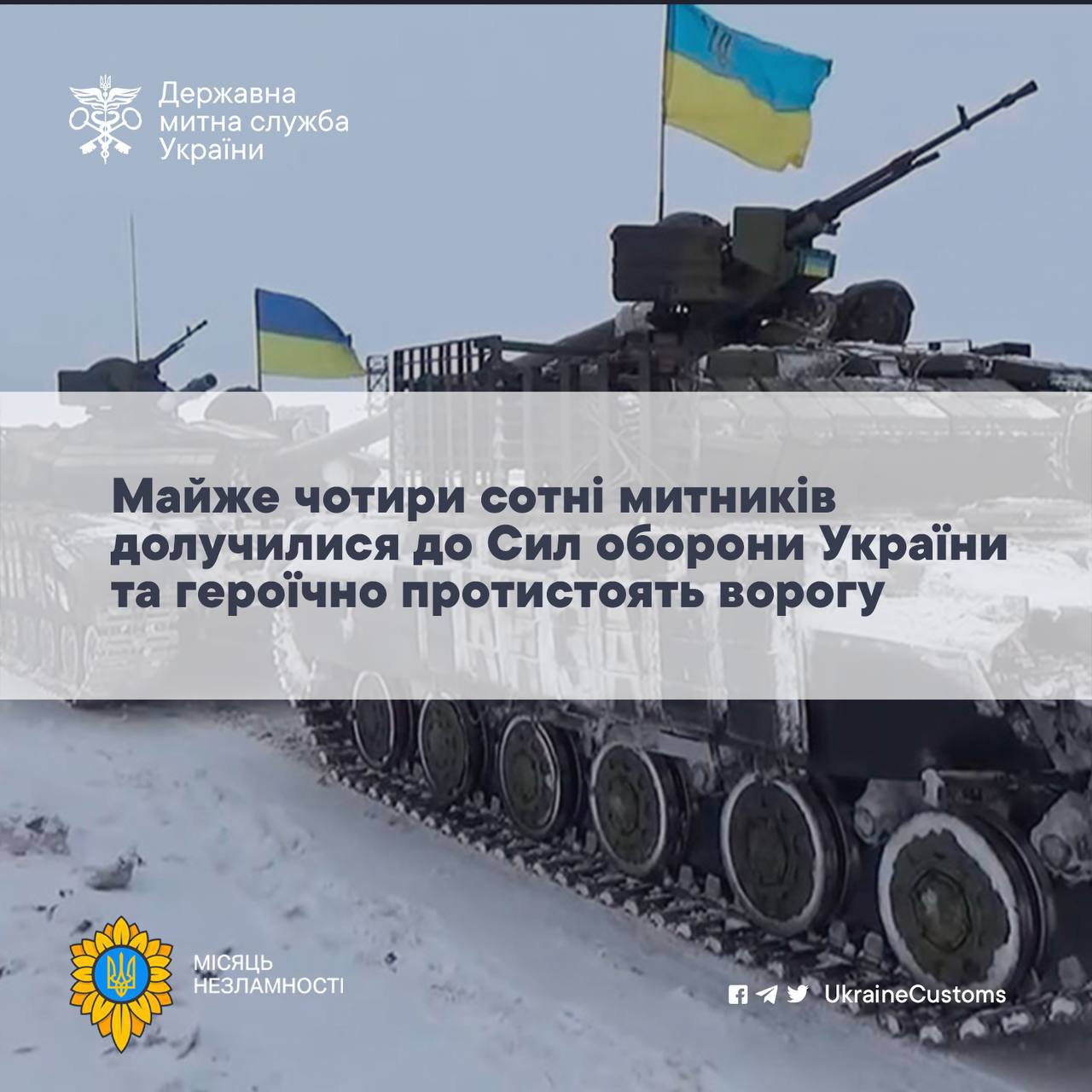 🔹Наразі вже майже чотири сотні працівників митниці долучилися до Сил оборони України і героїчно протистоять ворогу. Їх кількість буде збільшуватися відповідно до потреб фронту. Водночас чимало митників надають посильну допомогу нашим захисникам.
