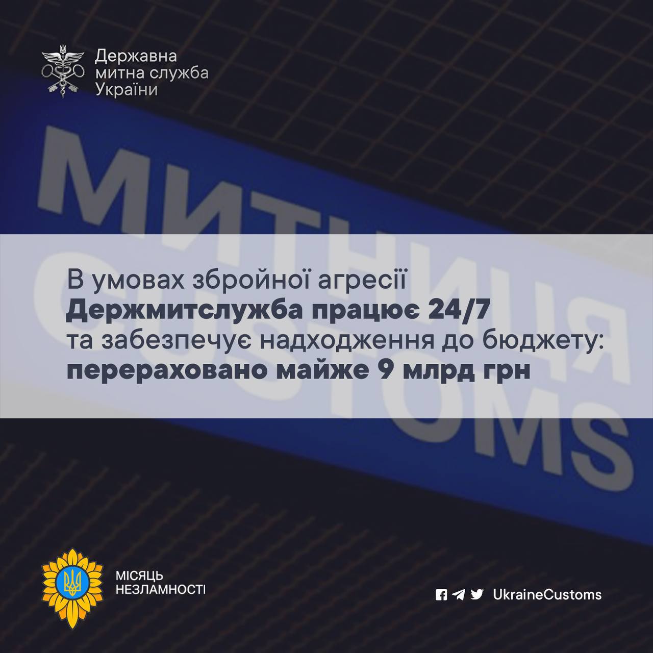 Весь цей час Держмитслужба працює у режимі 24/7, як і всі державні установи, та виконує свої завдання. У надскладних умовах збройної агресії до Державного бюджету перераховано майже 9 млрд грн. Окремо дякуємо представникам бізнесу за їх державницьку позицію.