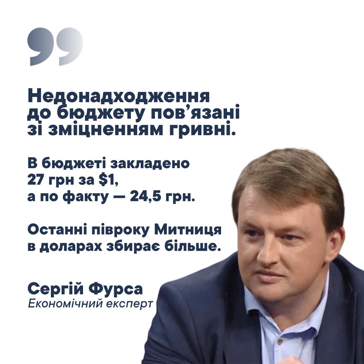 - Так, насправді саме через цю різницю. Звідки гроші з Митниці? Це відсоток від вартості товару. Товар виражаємо в доларах. Відповідно, коли вартість товару в доларах залишилася такою ж, а в гривні вона знизилася, тому що курс гривні зміцнився, ви отримуєте менше податків. Це абсолютно природний процес, ми бачили його і минулого року. Якщо ми просто подивимося на доларові показники Митниці за останні півроку, то побачимо, навпаки, до речі, зростання ефективності»