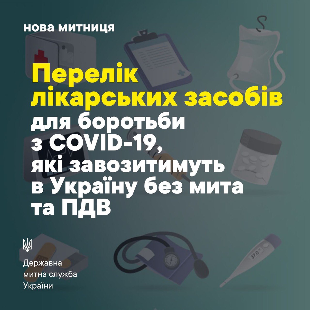 20 березня Уряд звільнив від сплати мита та ПДВ імпортерів, які ввозять в Україну лікарські засоби, медичні вироби та медичне обладнання, призначене для боротьби з COVID-19. Перелік таких товарів міститься у відповідній постанові за посиланням: https://bit.ly/3dntrHo