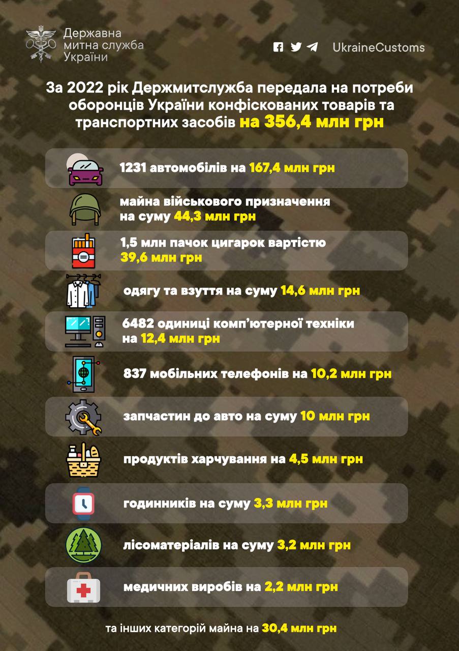 🛃 За 2022 рік Держмитслужба передала на потреби оборонців України конфіскованих товарів та транспортних засобів на 356,4 млн грн