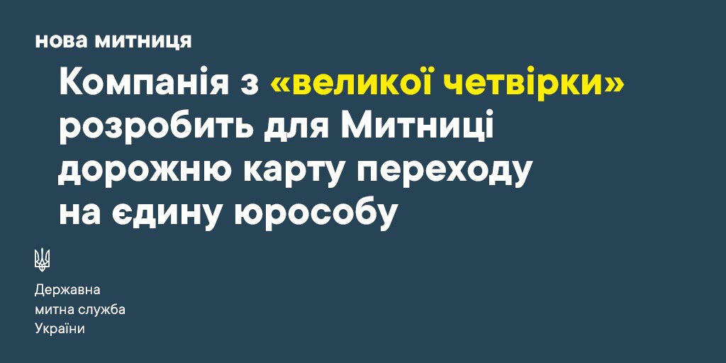 Аудиторська компанія з “великої четвірки” розробить для Митниці дорожню карту переходу на єдину юрособу. Митниця підписала відповідну грантову угоду з Програма USAID «Конкурентоспроможна економіка України».
