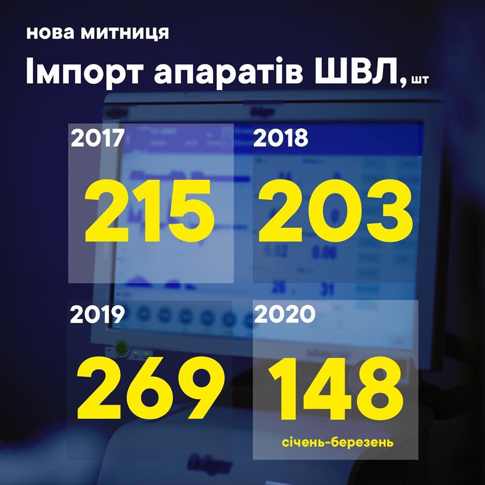 За три місяці 2020 року в Україну завезли 148 апаратів штучної вентиляції легенів (ШВЛ): у січні — 18 штук, у лютому — 97 шт., у березні (станом на 27 березня) — 33 шт.