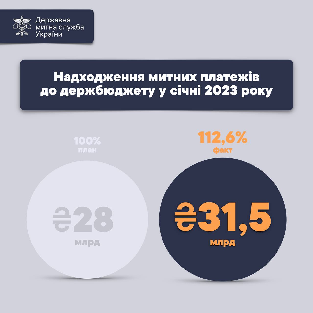 ✅ У січні 2023 року завдяки стійкості та відповідальності українського бізнесу Державна митна служба України перерахувала до державного бюджету 31,5 млрд грн митних платежів при запланованому показнику 28 млрд грн.